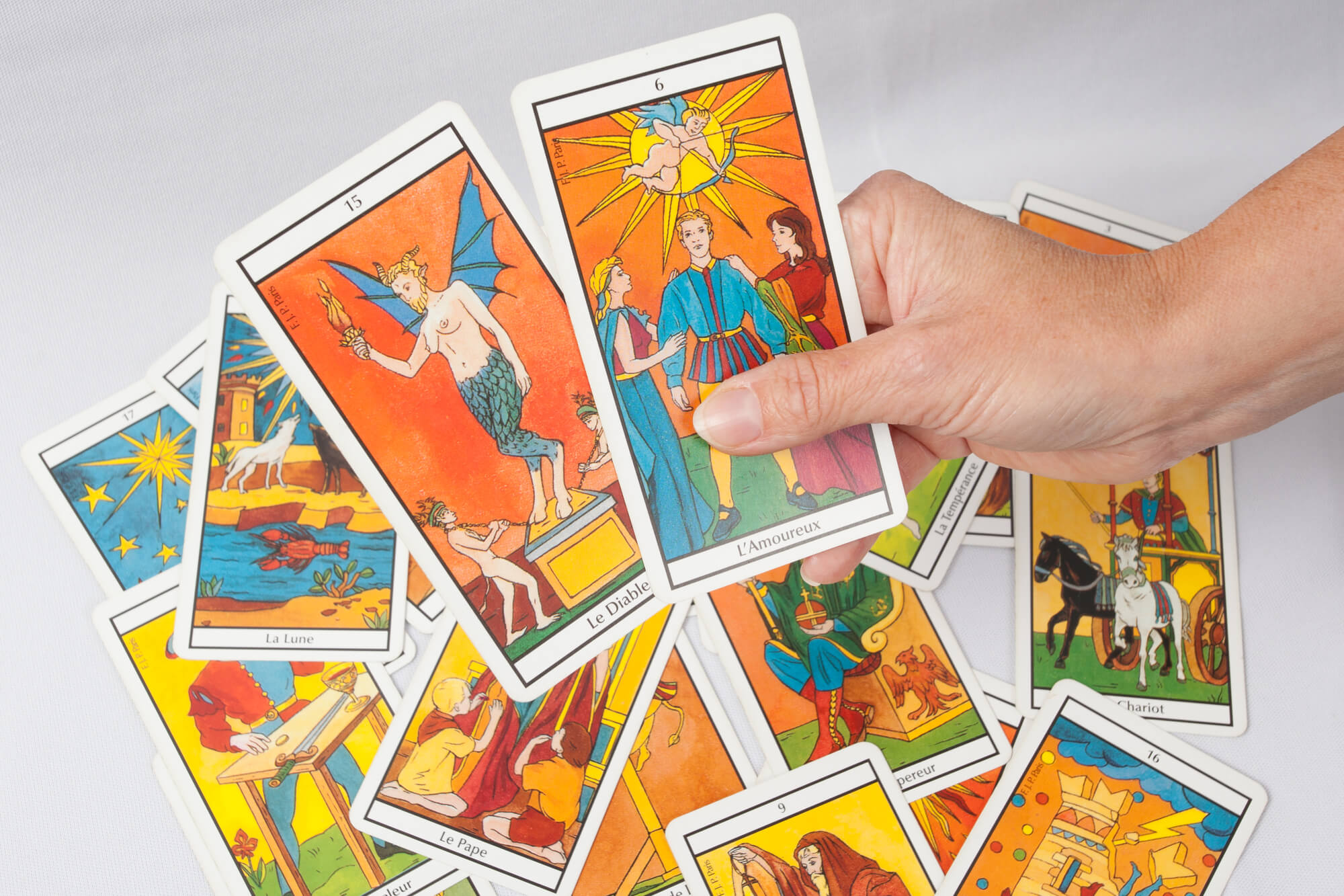 Традиційні колоди (наприклад, класична колода Райдера-Вейта) містять 78 карт , усі з унікальними значеннями, і коли ви витягуєте картку, ідея полягає в тому, що вона містить повідомлення для вас і вашого запиту.
